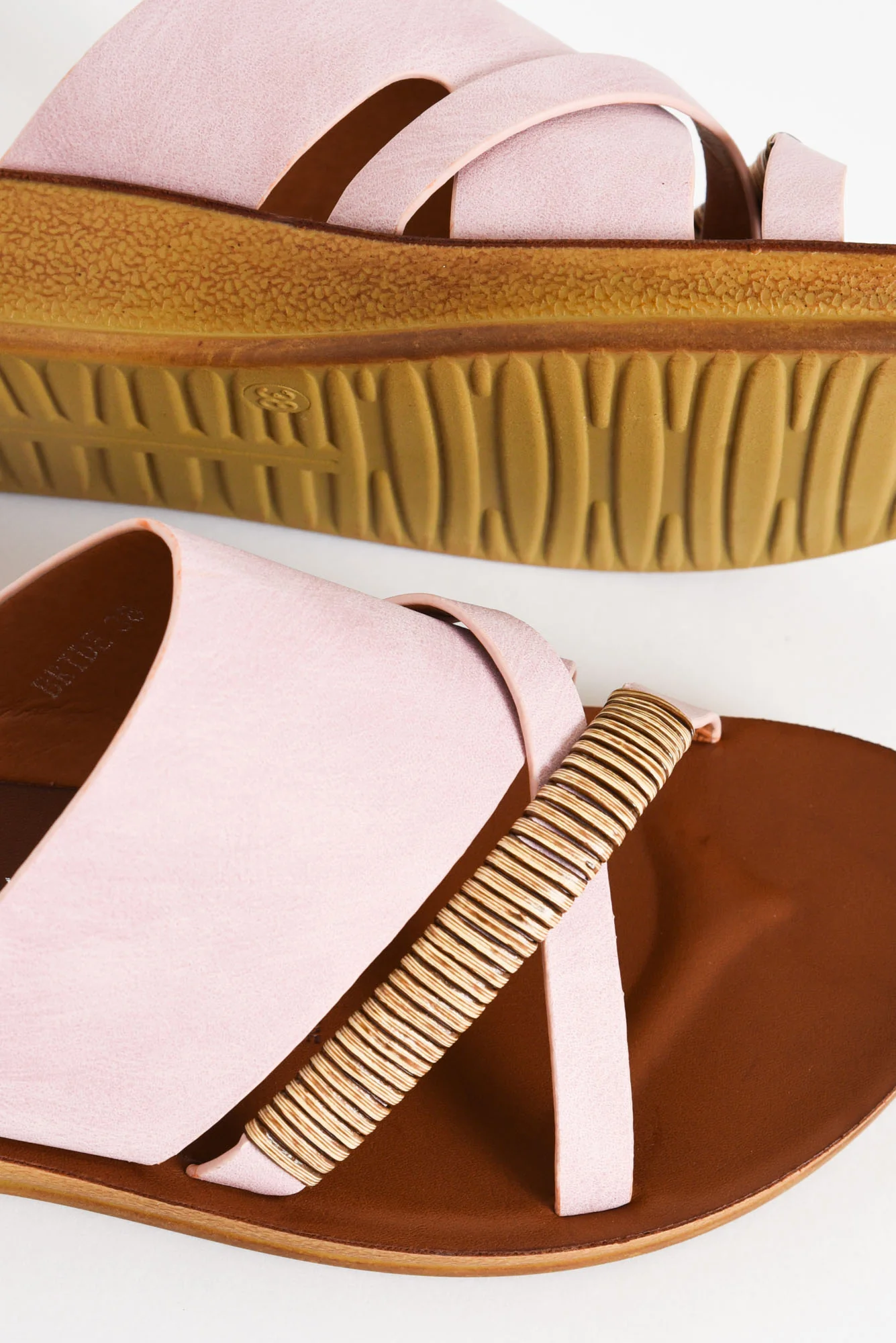 Crossover straps on the toes featuring coconut effect detailing and a supportive, wide strap over the footbridge